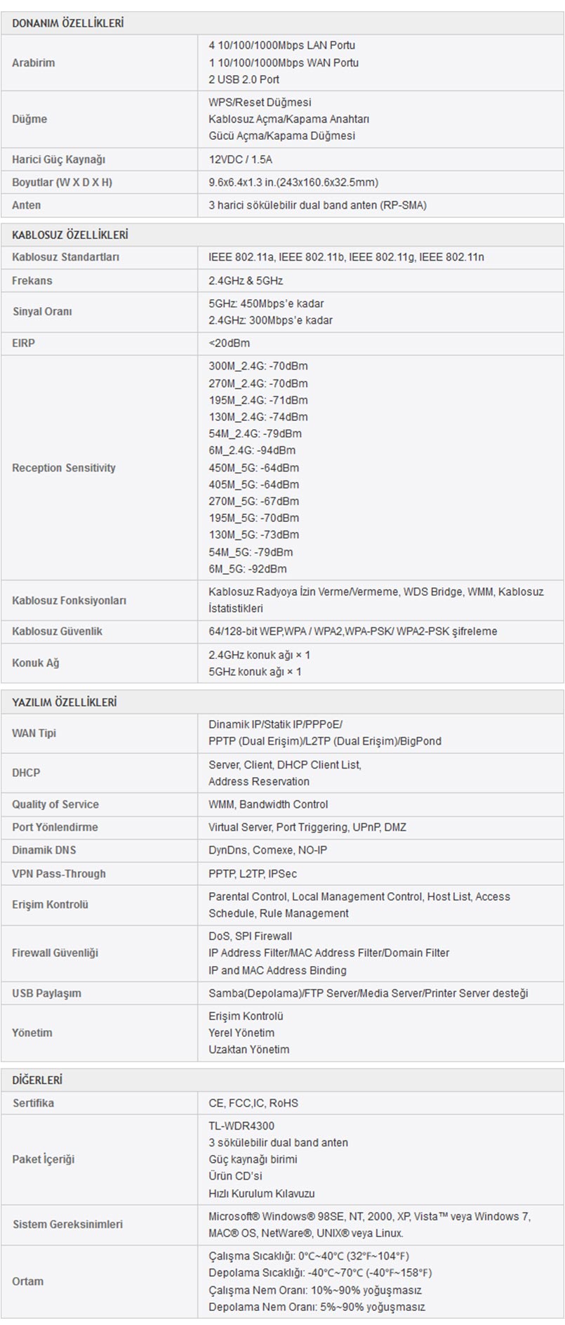 TP-LINK’in TL-WDR4300’ü, kristal netliğindeki 5GHz bandı kullanan 450Mbps ve klasik 2.4GHz bandı kullanan 300Mbps çarpıcı yüksek hızları birleştiren, performansı optimize edilmiş eş zamanlı bir dual band kablosuz router’dır. Eş zamanlı dual band ile kullanıcılar, büyük bir ev veya ofis kurulumunda aynı anda bant genişliğini yoğun kullanan çeşitli uygulamaları desteklemek için toplam 750Mbps bant genişliğine sahip olurlar. E-mail göndermek veya web’de dolaşmak gibi basit görevler, 300Mbps’de 2,4GHz bandı tarafından idare edilebilirken, aynı zamanda online oyun veya HD video streaming gibi gecikmeye daha duyarlı görevler 450Mbps’de 5GHz bandında işlenebilirler. Beş gigabit portu ve 800Mbps+ donanım NAT’ı ile kablolu cihazlarınız, ışık hızında, gecikmesiz bağlantılara sahip olmanın yanı sıra, flash depolama, yazıcılar, ftp server’lar ve medya player’ların paylaşılmasını sağlayan 2 USB 2.0 portu ile kullanıcılar güçlü bir ev medya ağı kurabilirler.