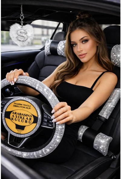 Arabasına Aşıklar Kulübü Gümüş Taşlı Set Direksiyon Kılıfı+Yastık Çifti+Kemer Çifti