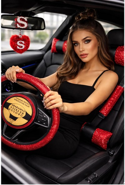 Arabasına Aşıklar Kulübü Kırmızı Taşlı Direksiyon Kılıfı+ Yastık Çift+Kemer Çift