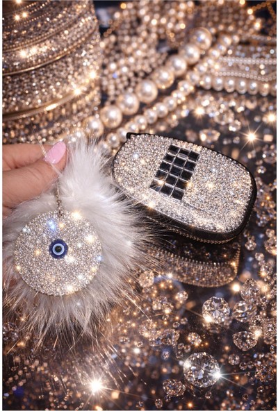 Arabasına Aşıklar Kulübü Elif Vav Gümüş Taşlı Beyaz Tüylü Dikiz Ayna Süsü Aksesuarı