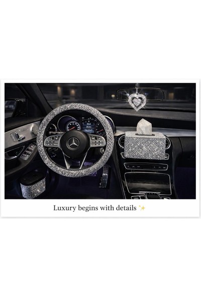 Arabasına Aşıklar Kulübü Gümüş Taşlı Set Direksiyon Kılıfı+Kalp Dikiz Süsü+Peçetelik+Çöp Kutusu+Hediye Anahtarlık