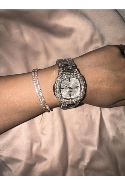 Arabasına Aşıklar Kulübü Gümüş Full Taşlı Saat ve Çiftli Bileklik Seti