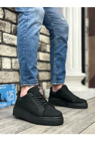 BA0548 Boa Kalın Yan Desenli Yüksek Siyah Taban Siyah Bağcıklı Spor Erkek Ayakkabı