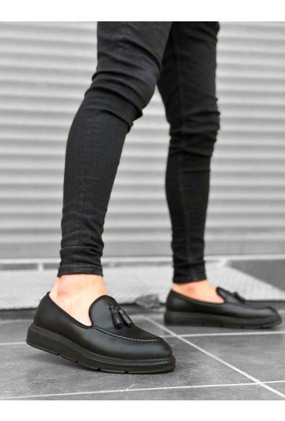 BA0005 Bağcıksız Yüksek Siyah Taban Klasik Cilt Deri Püsküllü Corcik Erkek Ayakkabı