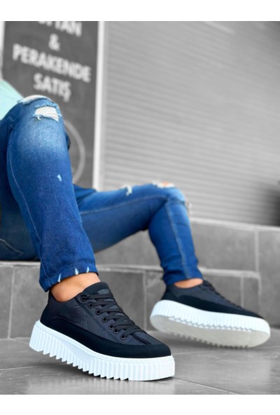 BA0548 Boa Kalın Yan Desenli Yüksek Siyah Taban Siyah Bağcıklı Spor Erkek Ayakkabı