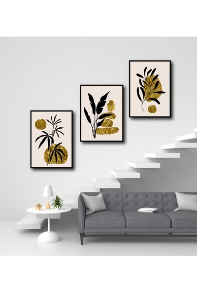 AR AJANS KANVAS TABLO Yaldızlı Bitkiler Üçlemesi Dekoratif Çerçeve Görünümlü 3'lü Set Mdf Tablo