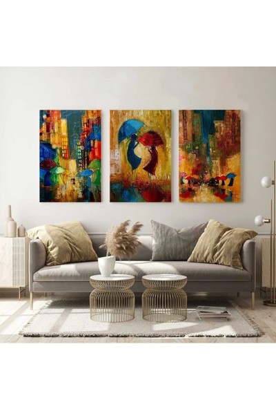 AR AJANS KANVAS TABLO Şemsiyeli Çift Soyut Aşk Love Yağmur Dekoratif Modern Üçlü Kombin 3 Lü Set Kanvas Tablo ART0057