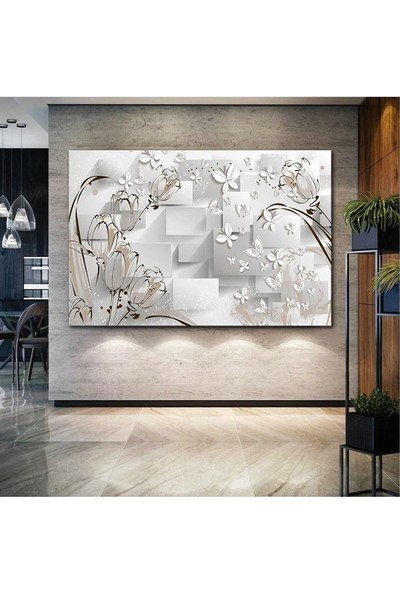 Ar Ajans Kanvas Tablo Porselen Beyaz Çiçekler Uçan Kelebekler Kanvas Tablo