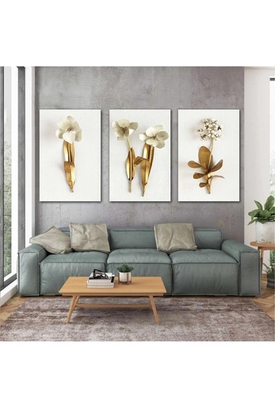 AR AJANS KANVAS TABLO Altın Dallı Beyaz Çiçekler Modern Dekor Üçlü Kombin 3 Lü Set Kanvas Tablo ART0095