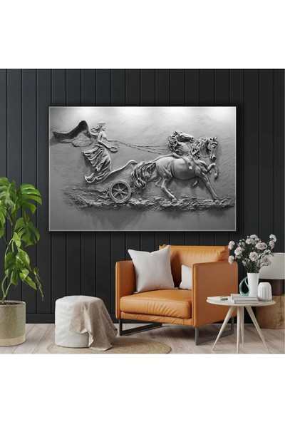 AR AJANS KANVAS TABLO At Arabası Süren Kanatlı Melek Siyah Beyaz Hermes Tanrı Duvar Rölyef Heykel Kanvas Tablo ART0099