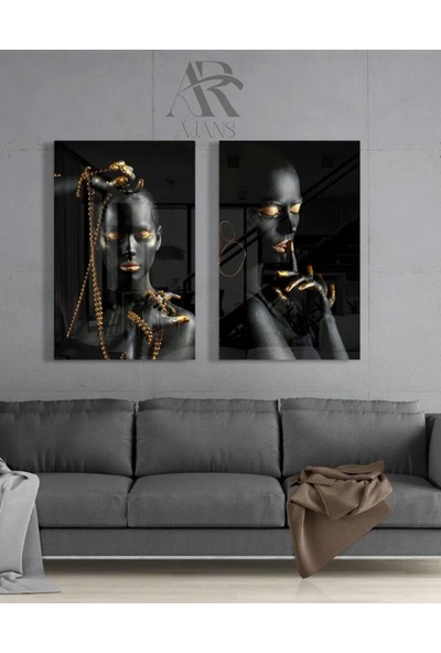 AR AJANS KANVAS TABLO Siyah ve Altın Zarafetli Kadınlar Cam Tablo