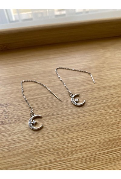 Arasera Çelik Gümüş Renk Zirkon Taşlı Zincir Detaylı Küpe