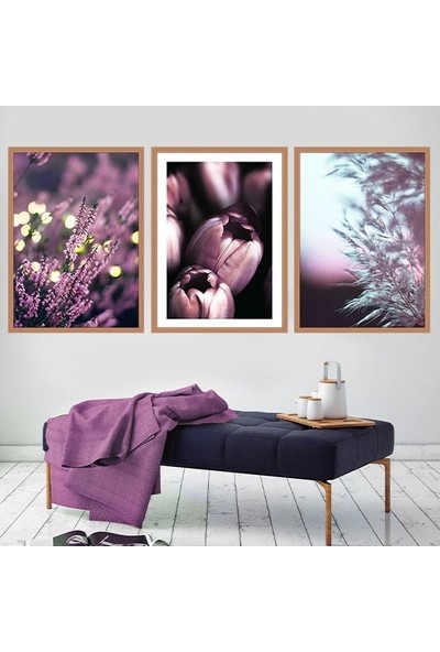 Mor Lavanta ve Lale Esintisi Üçlü Çerçeve ve Poster Seti - B1021