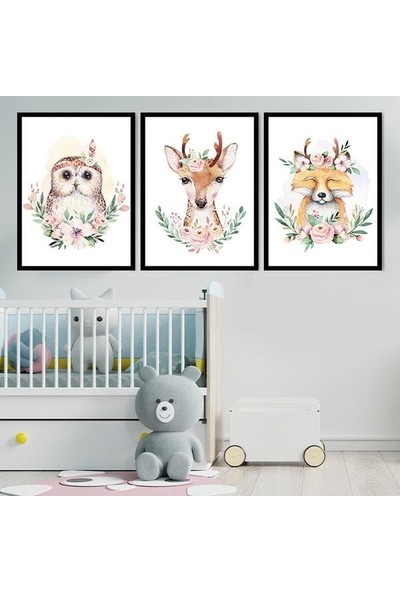 Çiçekli Baykuş, Geyik ve Tilki Üçlü Çerçeve ve Poster Seti - HA1003