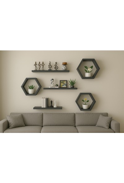 Dekoratif Altıgen Duvar Rafı/kitaplık (Antrasit)