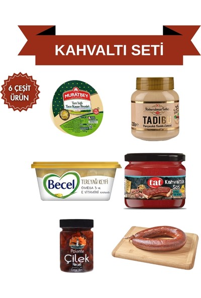 Araz Et Lezzet Dolu Kahvaltı Seti (6 Çeşit) - 1 Adet 300 gr Kaşar Peyniri + 1 Adet 330 gr Tadıbu Fındık Ezmesi+ 1 Adet Becel+ 1 Adet Tat Kahvaltılık Sos + 1 Adet Polente Çilek Reçeli + 1 Adet 1 kg Dana Sucuk